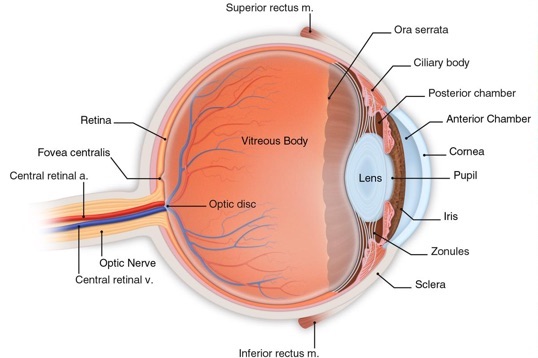 Lens – The fine focusing element of the eye. It can vary its curvature to focus at different distances but starts to lose that full ability for most people between the age of 40 to 50.